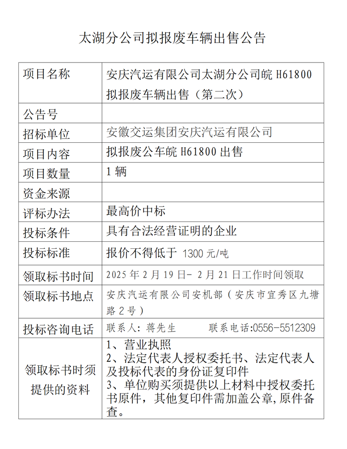 太湖分公司擬報(bào)廢車輛出售公告