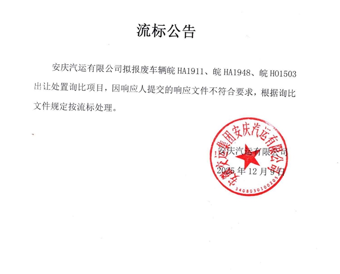 擬報廢公務(wù)車皖HA1911、皖HA1948、皖HO1503出讓處置流標(biāo)公告